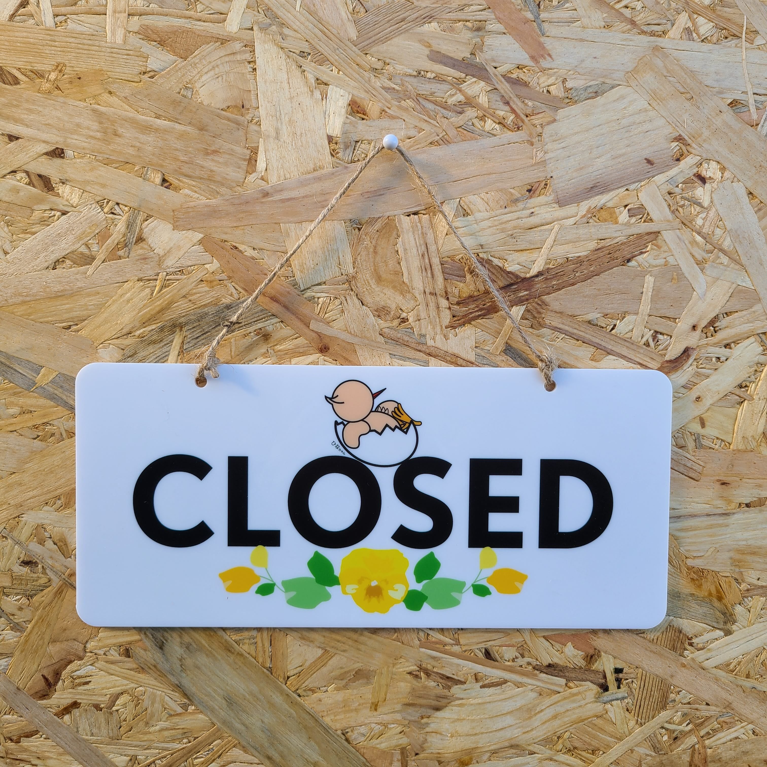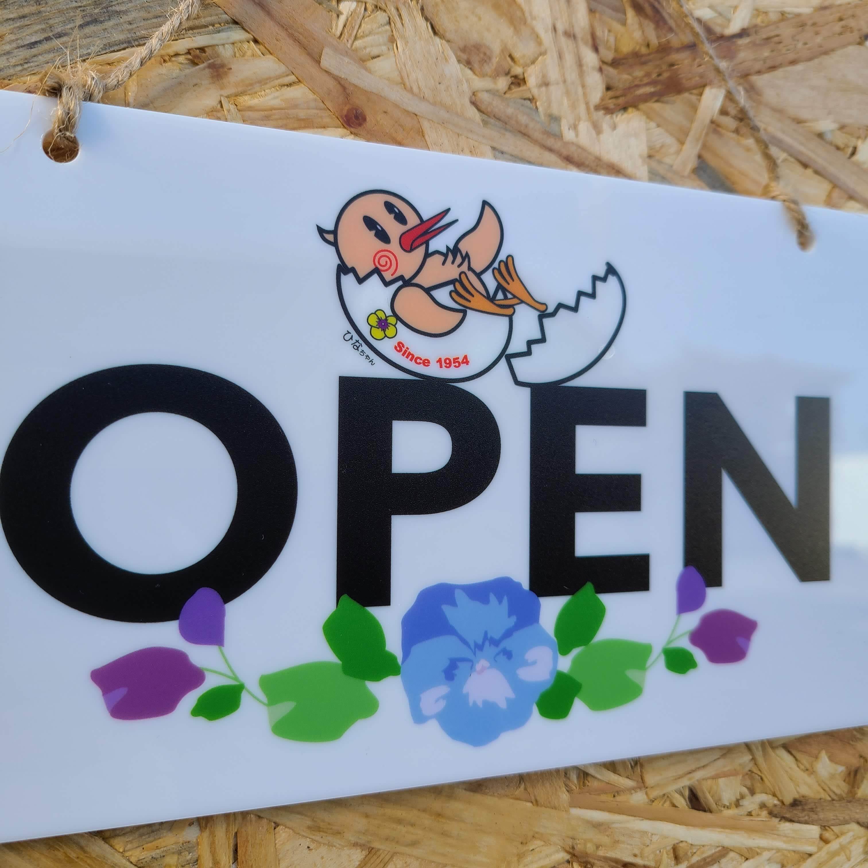 鴻巣市のメインキャラクター「ひなちゃん」と鴻巣市の花パンジーをあしらった両面プレートの看板